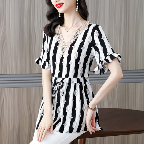 2022V领雪纺短袖T恤显瘦时尚女上衣夏季收腰大码妈妈打底小衫 宇浩服饰B THFS8827