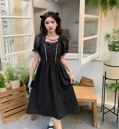法式方领连衣裙设计感显瘦开叉中长款气质短袖A裙子 萌萌 MMSSFS7098